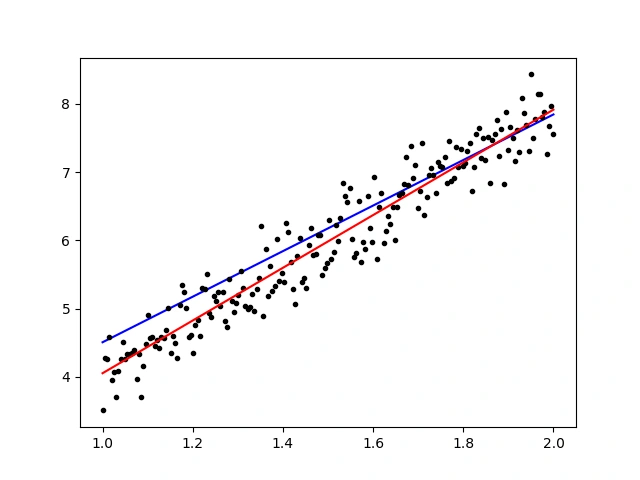 When apply a classic ordinary least squares algorithm to the data used in figure 1, the new regression line (shown in red) appears to fit the data well, but is it really better? We can get a definitive answer by comparing the squared errors. The mean least-squares error for the regression calculated using a machine-learning gradient-descent algorithm was 0.0953. The mean least-squares error for the classic OLS algorithm was 0.0773, a superior result.