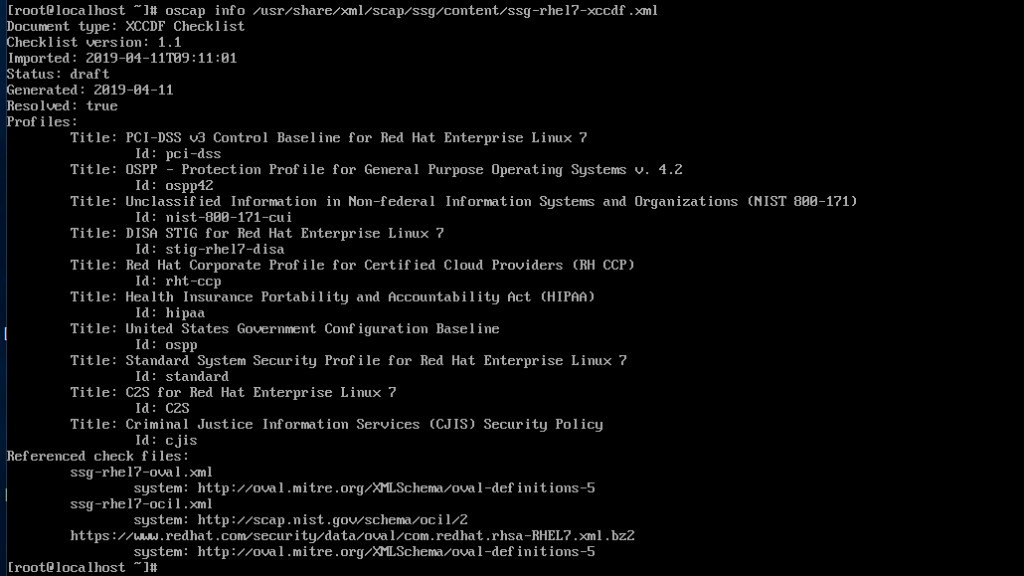 Let's see what the RHEL 7 one can do. Use the oscap command, and refer it to the XCCDF file: