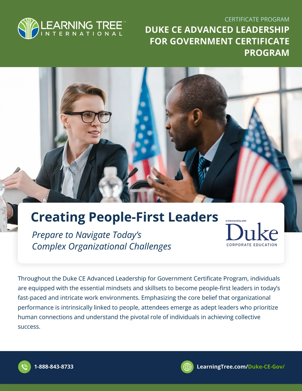 The BR Duke CE Advanced Leadership for Government Certificate Program is designed to equip individuals with essential mindsets and skillsets to become people-first leaders in today's complex work environments. The program emphasizes the importance of human connections in achieving organizational success.